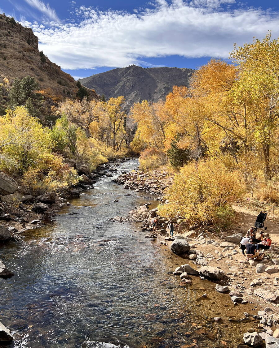 The rolling pathway skirts along the creek's south bank, about five to ten feet above the trail, lined with cottonwood, oaks and willows. When we visited, these trees were at their colorful best during fall. The colors arrive later here than in the higher elevations, where most of the aspen groves are, so we enjoy this delayed burst of foliage.