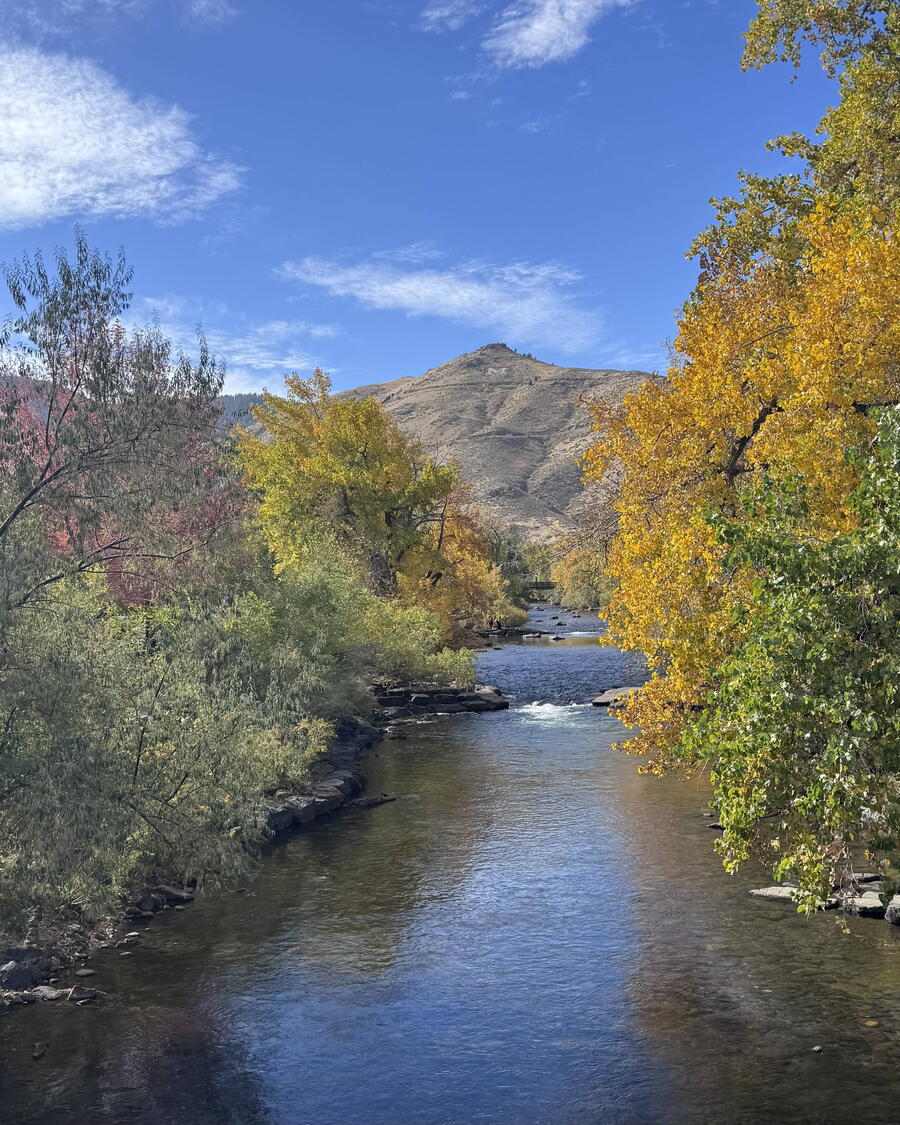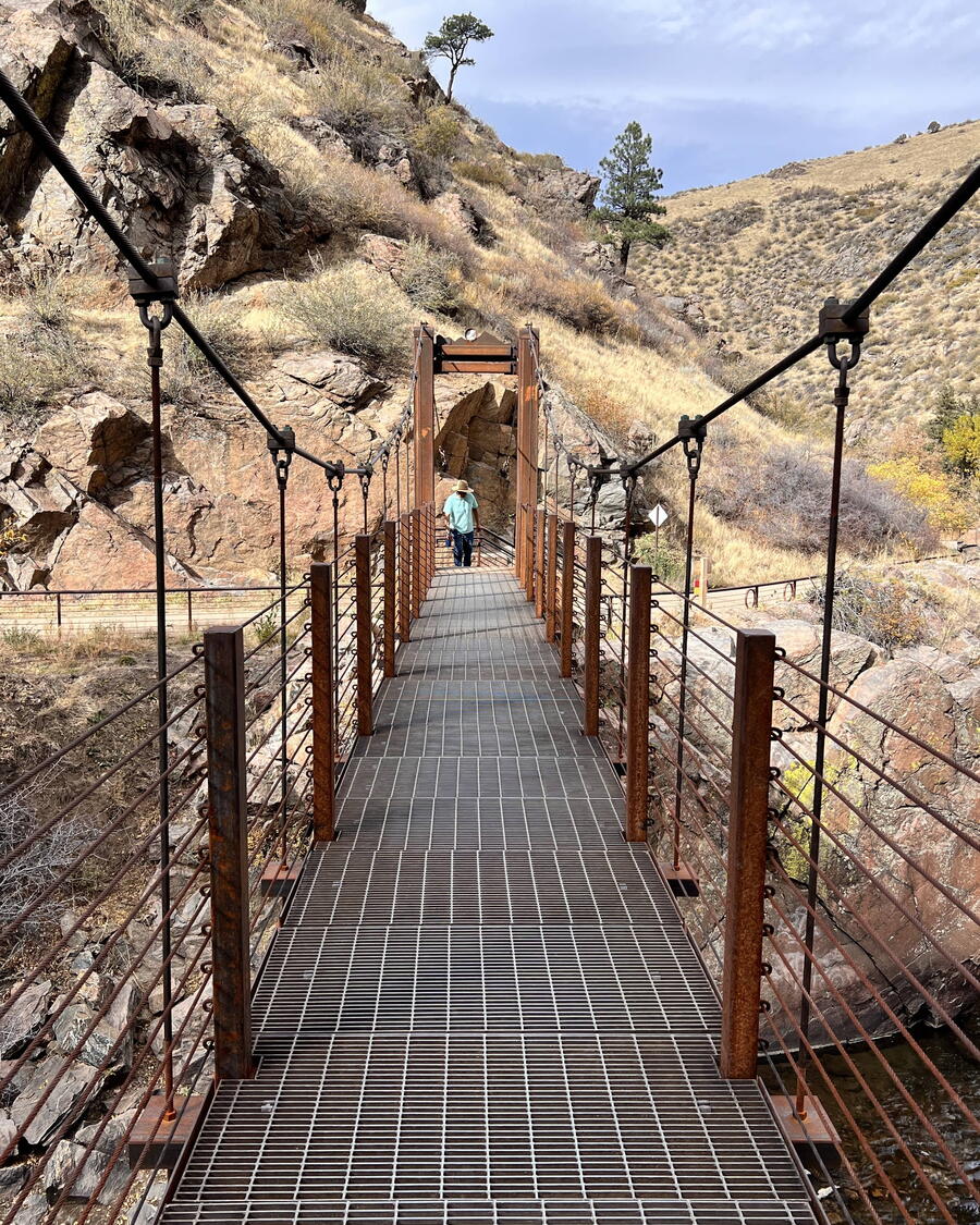 You’ll descend a multi-tiered steel staircase from the Gateway parking lot like those at ski resorts. It’s probably constructed like this because visitors will probably want to use the trails during winter, and these stairs are ideal for snow. It’s a short walk on a concrete path to the bridge spanning Clear Creek to the beginning of Peak to Plains, which goes out for about a mile and back.