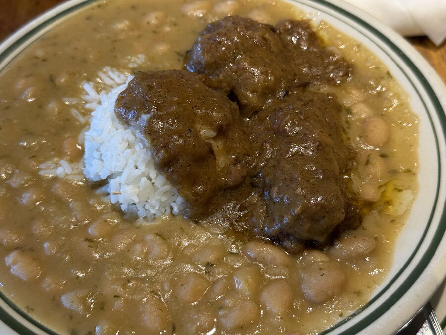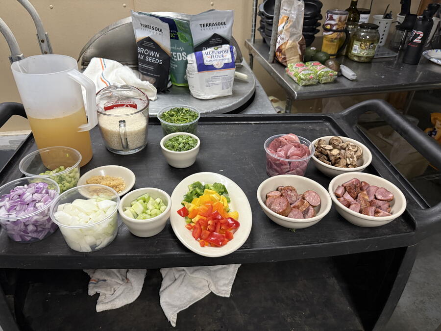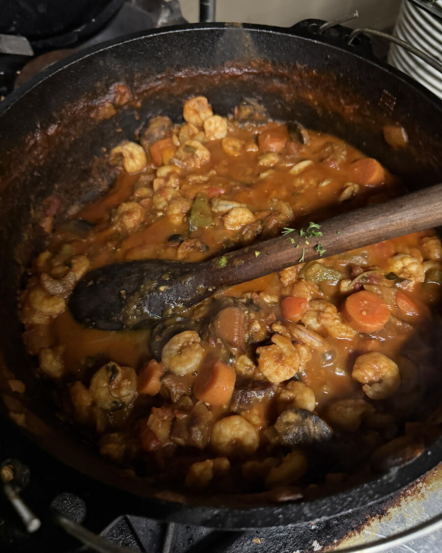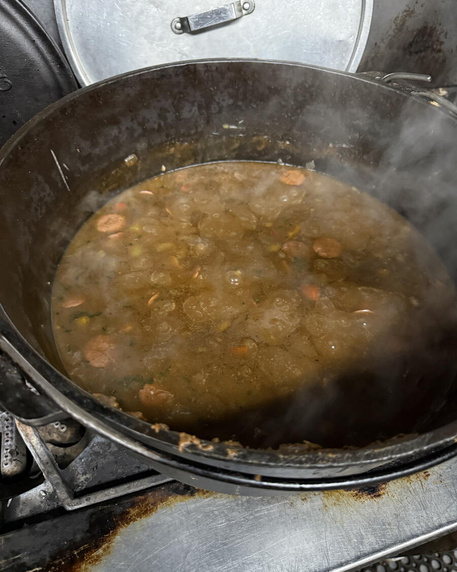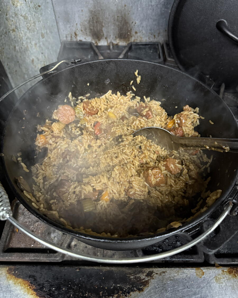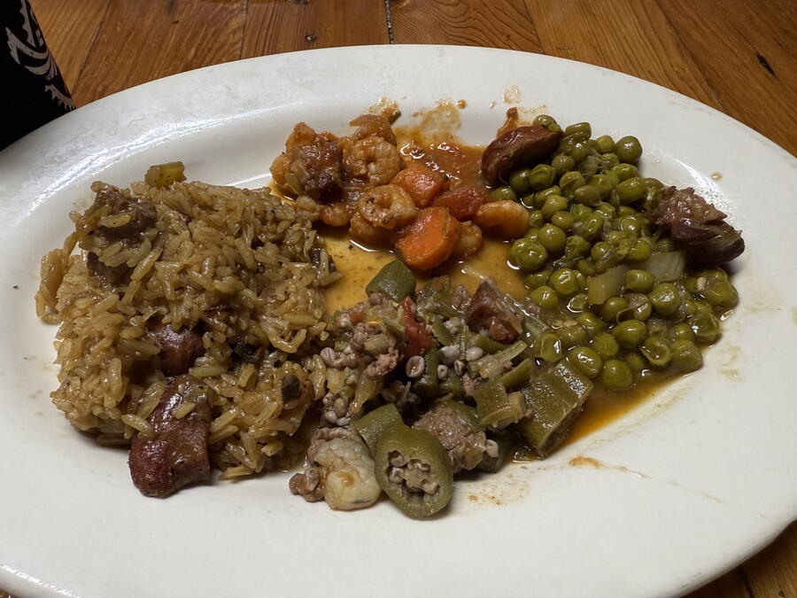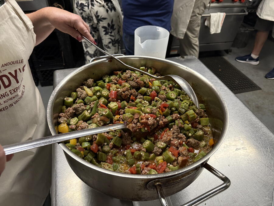 We made jambalaya, gumbo, shrimp creole, smothered okra, and petite pois (young peas). I handled the last dish, which is also known as roux peas, consisting of the trinity (onions, bell peppers, celery), broth, roux, bacon, and Andouille, which Spuddy makes on the premises. Whenever we achieved the way he liked it, he would do a little celebratory dance. So, not only was the meal excellent, but we also couldn’t help but feel happy with him.