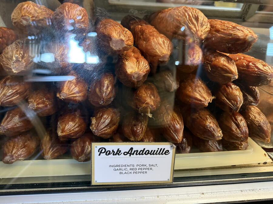 Andouille sausage is made from pork, spiced with black pepper and cayenne, and smoked for at least a half day in sheds burning aromatic wood like pecan. French settlers developed the basic recipe, but German immigrants contributed to their smoking methods. In the River Parishes, so many establishments make this staple of local cooking, there is an official trail to enable people to try the real deal. With these places, one which is a restaurant/butchery and the other a just butchery, I finally appreciated the difference between the rubbery supermarket Andouille and superior ones made in Cajun country.