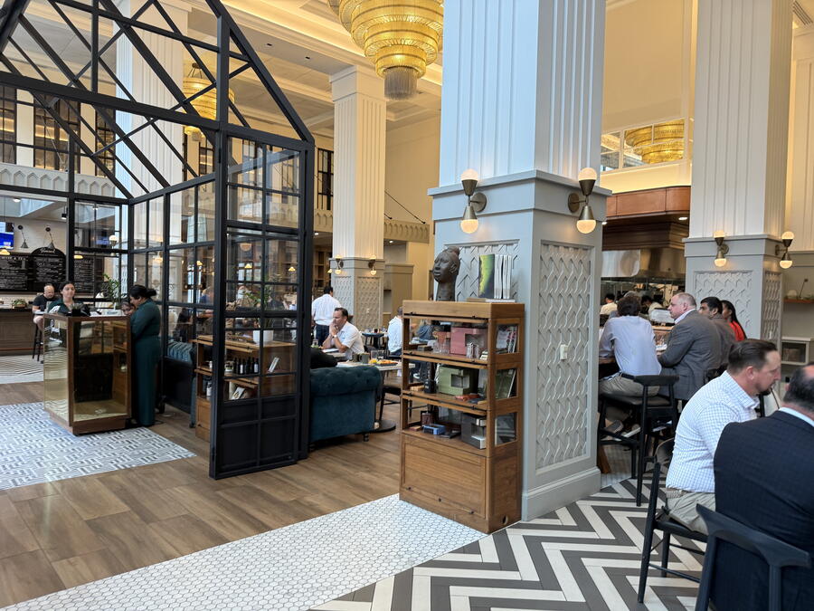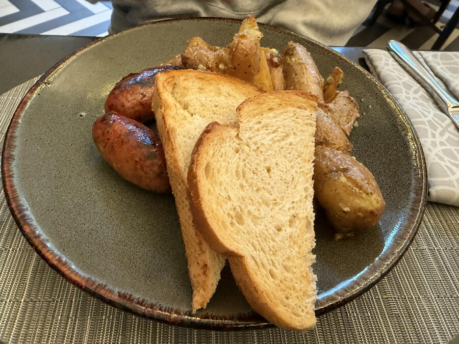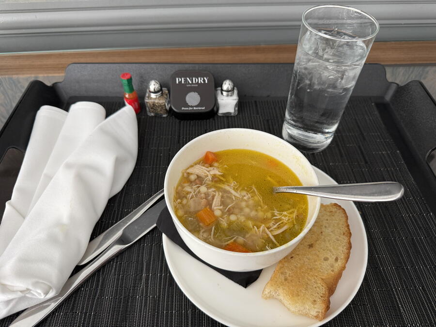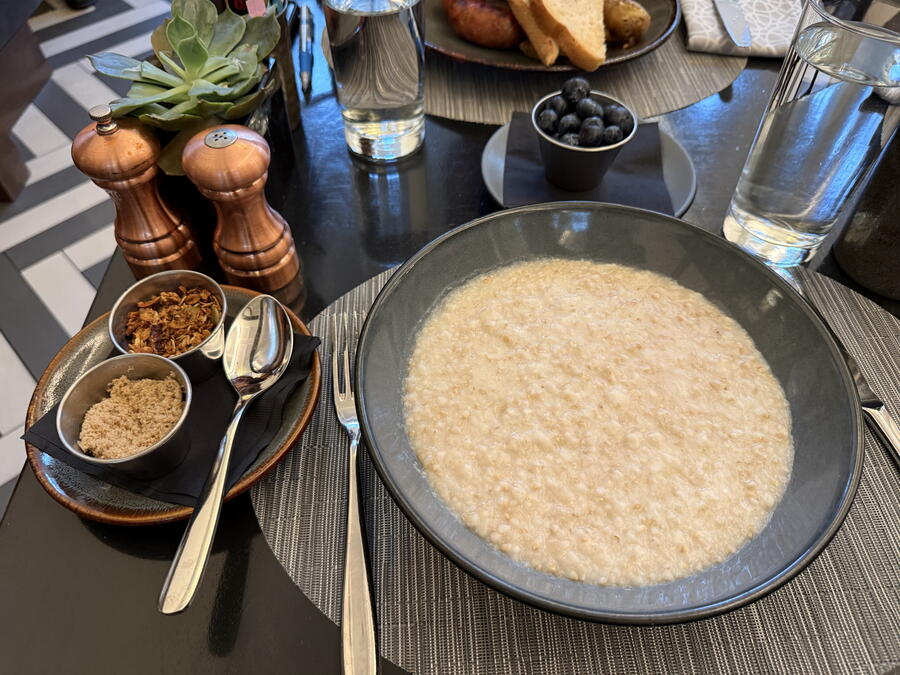 The Pendry is a relatively small hotel, but it has a half-dozen in-house restaurants and bars. We experienced two of them, along with having a minor room service order. Now, we probably wouldn’t have done this if it weren’t for that hotel credit, but since JRS wasn’t feeling well, we tried some chicken noodle soup, which turned out to be quite tasty. The next day, we had breakfast at Provisional, the main restaurant. We ordered oatmeal and a meal of side dishes (potatoes, chicken sausage and sourdough toast).