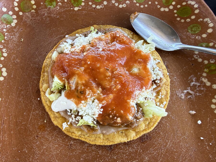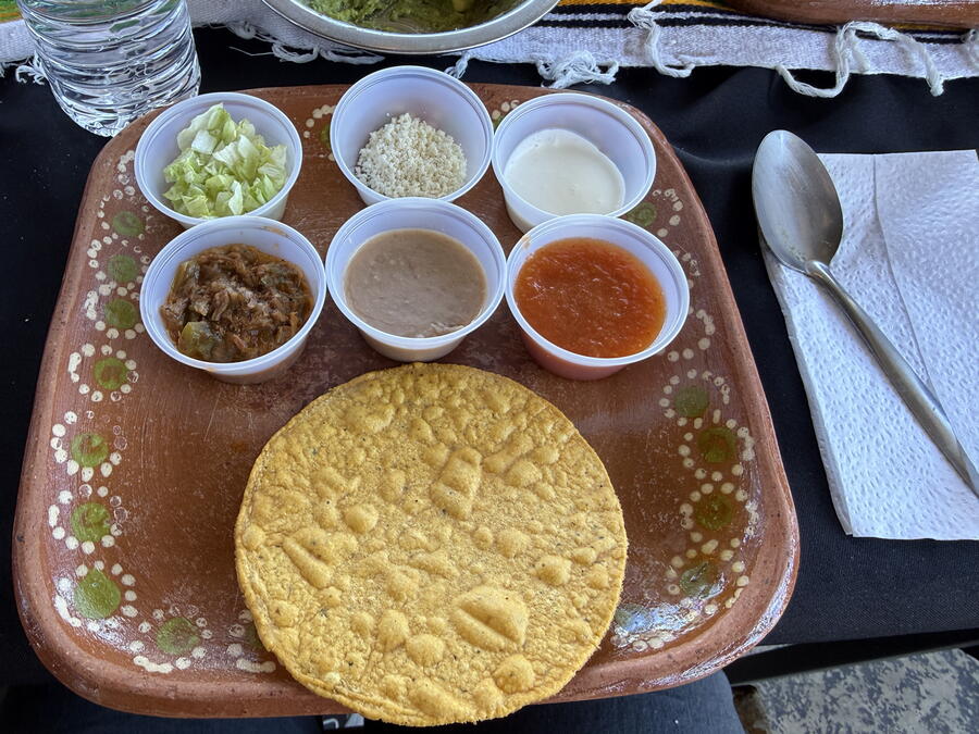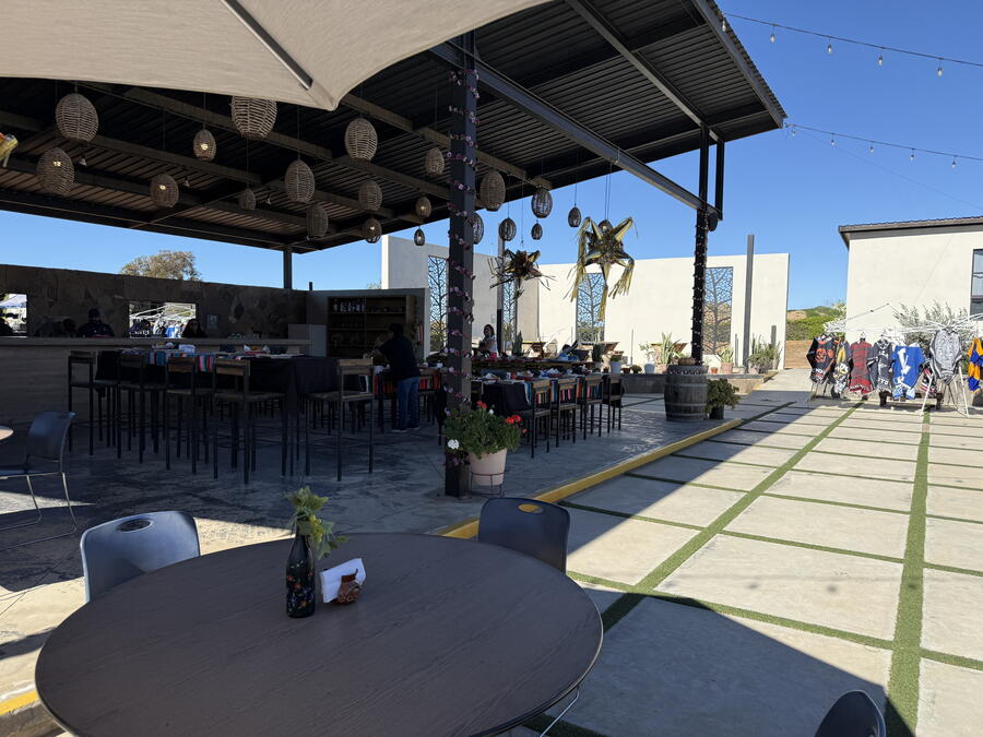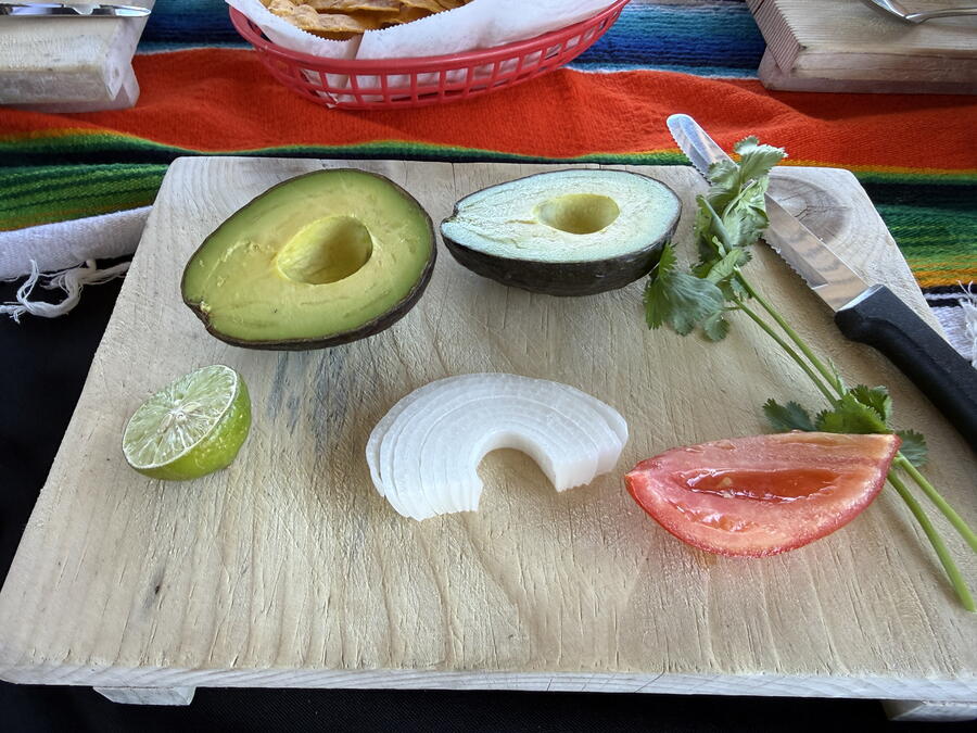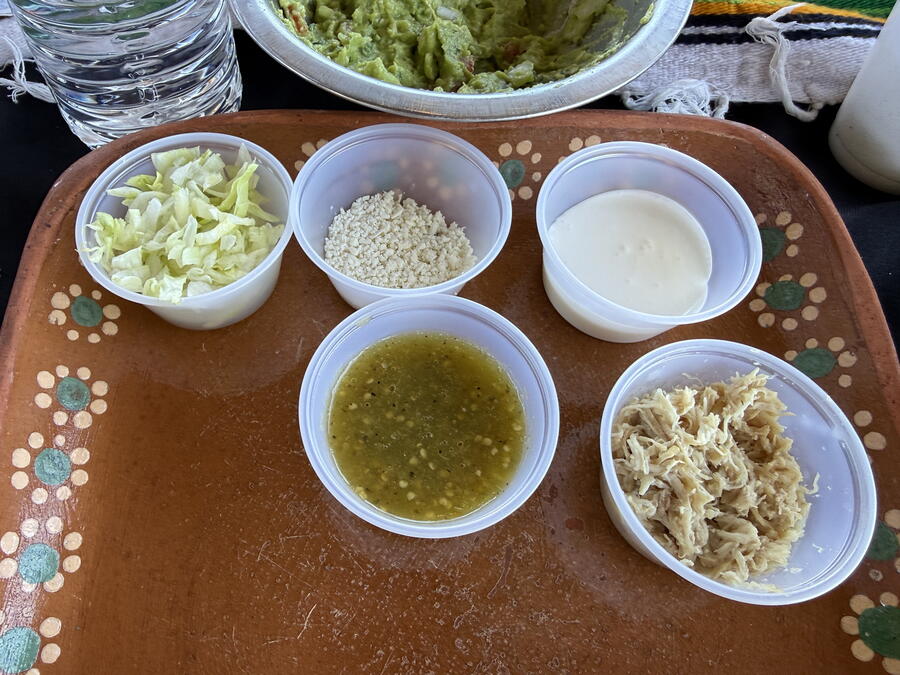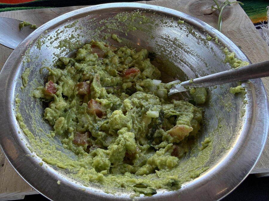 We took a short drive through the center of town before heading out to the Valle de Guadalupe and a private estate that’s used for parties and events. Several vendors sold the usual Mexican knickknacks like ceramic figures and jewelry but one finger-painted some impressive works. Sitting down at long tables with small boards for cutting and prepared ingredients, we started with making some guacamole while snacking on chips and salsa. The servers brought frozen margaritas to drink, and we could have as much as we wanted. Unfortunately (or fortunately), they didn’t have much tequila in them, which is probably by design.