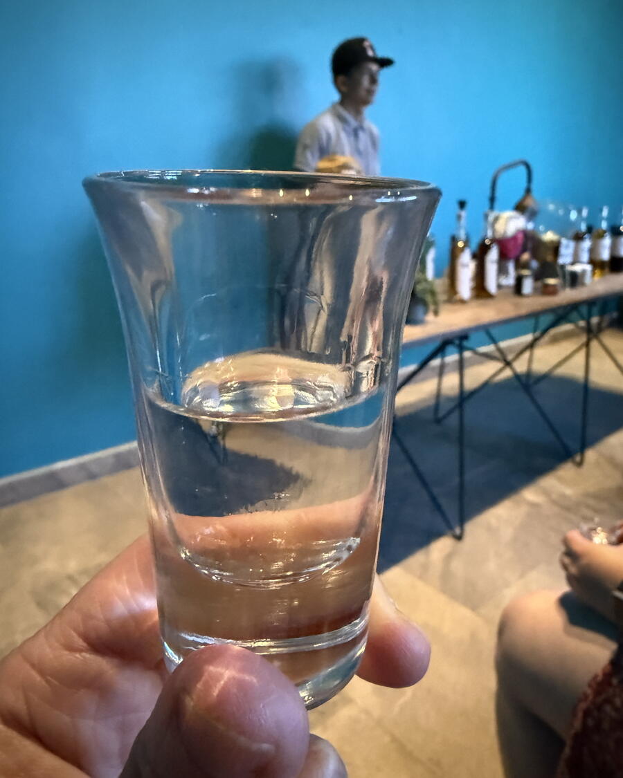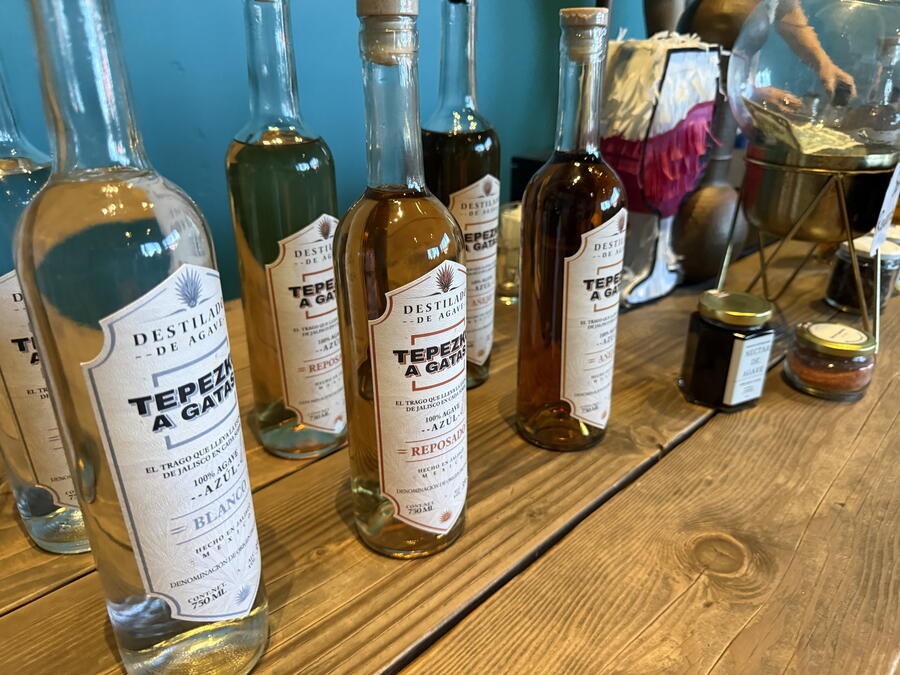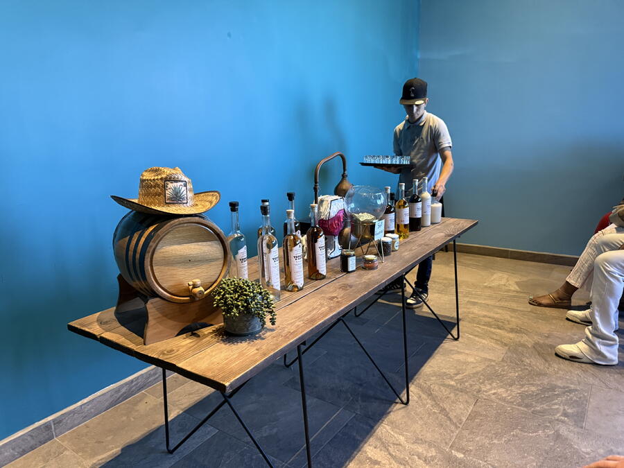 Instead, we sat down on rows of wooden benches with a long folding table in the front, holding bottles of tequila, a small wooden barrel with a straw hat on top of it, and a small distilling apparatus. The staff worker explained we would try seven different kinds of tequila, which included regular blanco, reposado and anejo and four flavored varieties: mango, almond, coffee and coconut. Like with most liquors, I prefer the straight stuff and rarely like the flavored varieties.