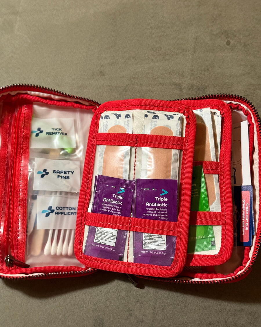 For starters, the kit contains the usual supplies – bandages of all sizes, alcohol pads and cleansing wipes, antibiotic, hydrocortisone, burn gel, scissors and tweezers. But there were also some surprising extras like a tick remover, a small sewing kit (hopefully not to do DIY stitches) a compressed towel that expands when watered and nosebleed plugs. The pouch, which has pocketed sleeves to hold the items, is sturdy yet compact and can easily fit into a glove compartment or a backpack.
