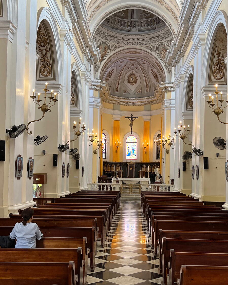 Two Catholic churches were the main points of interest in our tour. La Parroquia San Francisco de Asis was just a few blocks from our drop-off point. It featured a catacombs area that we didn’t visit because it was roped-off. Besides the sanctuary, we viewed statues and paintings in a side hallway. The remarkable artwork here was a statue of the Virgin Mary shown pregnant, which is rarely seen in religious artifacts. The second church was Catedral Basilica Manor de San Juan Bautista, located close to the waterfront and the Governor’s mansion. This was a larger and grander cathedral with chapels off either side and even more elaborate artwork.